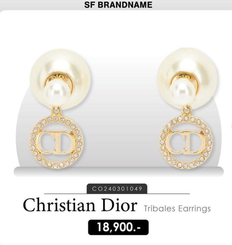 ต่างหูรุ่น Tribales Earrings ที่มีเอกลักษณ์เฉพาะตัวคือดีไซน์ต่างหูมุกที่ประดับด้วยมุกเรซินทั้งด้านหน้าและแป้นด้านหลังประกบกัน ความพิเศษกว่าตรงที่มีดีเทลอะไหล่ทองห้องเป็นรูปวงกลมพร้อมโลโก้ CD ประดับโดดเด่นอยู่ตรงกลาง ที่สำคัญคือตัวทรงวงกลมยังถูกประดับด้วยเพชรอว่าเป็นต่างหูมุก DIOR ที่มีความน่ารักสดใส ที่แฝงได้ด้วยความหรูหรา ควรค่าแก่การเป็นเจ้าของ คุณสามารถเป็นเจ้าของต่างหูคู่นี้จาก SF Brandname ได้ในราคา 18,900 บาท