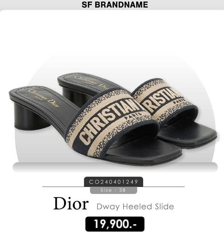 รองเท้าแตะแบบมีส้น Dway มีซิลลูเอทที่เหนือกาลเวลาและเป็นสัญลักษณ์ ส่วนบนของรองเท้าโดดเด่นด้วยการปักลายเซ็น 'CHRISTIAN DIOR' สีน้ำเงินเข้ม รองเท้าแตะมีส้นบล็อกสูง 4 เซนติเมตร (1.5 นิ้ว) ช่วยให้ทุกลุคดูทันสมัย พื้นรองเท้าสลักดาว สัญลักษณ์นำโชคของ Christian Dior ราคาจำหน่ายในเว๊ปไซต์ของ Christian Dior อยู่ที่ 35,000 บาท แต่คุณสามารถเป็นเจ้าของรองเท้าคู่นี้จาก SF Brandname ได้ในราคา 19,900 บาท