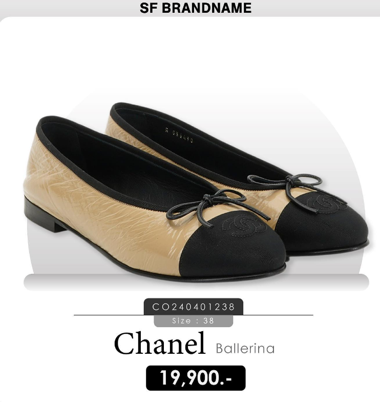หนึ่งในรองเท้าที่มีชื่อเสียงที่สุดของแบรนด์ Chanel Ballerina มีวัสดุและสีหลายประเภท เป็นหนึ่งในการลงทุนที่ดีที่สุดสำหรับแฟชั่นประจำวัน เนื่องจากสวมใส่สบาย มีสไตล์ และสามารถสวมใส่ได้ทั้งที่ทำงานและนอกที่ทำงาน รองเท้าคู่ที่สวมใส่ได้ในทุกโอกาสถือเป็นการลงทุนที่คุ้มค่า และที่ดีที่สุดคือ รองเท้าส้นเตี้ยเหล่านี้สามารถจับคู่กับชุดลำลองของคุณได้อย่างง่ายดาย คุณสามารถเป็นเจ้าของรองเท้าคู่นี้ จาก SF Brandname ได้ในราคา 19,900 บาท