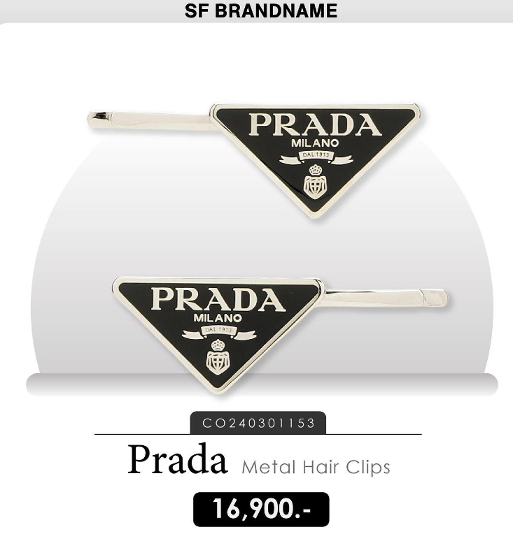 เสื้อผ้าที่เข้ารูปพอดีจะไม่สมบูรณ์ได้หากไม่มีเครื่องประดับผมที่เหมาะสม คอมพลีตลุคการแต่งตัวของคุณกับกิ๊บติดผมสีดำ 2 ชิ้นจาก Prada โดดเด่นด้วยแผ่นโลโก้สามเหลี่ยมอันเป็นเอกลักษณ์ของแบรนด์และโครงสร้างแบบบานพับ เสริมความแข็งแรงเมื่อใช้งาน ตัวกิ๊บผลิตจากโลหะ 100% จึงมั่นใจในเรื่องของความคงทน ราคาจำหน่ายในเว๊ปไซต์ของ Prada อยู่ที่ประมาณ 23,000 บาท คุณสามารถเป็นเจ้าของกิ๊บสุดอินเทรนด์ของปี 2024 จาก SF Brandname คู่นี้ได้ในราคา 16,900 บาท