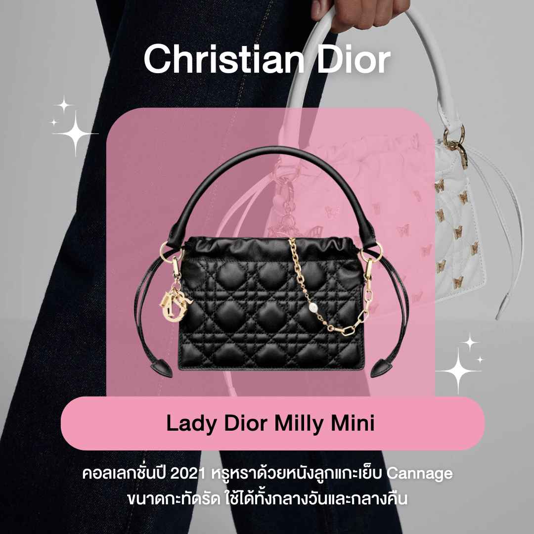 กระเป๋า Lady Dior Milly Mini เป็นผลงานเหนือกาลเวลาที่สวยงามซึ่งแสดงให้เห็นถึงความมุ่งมั่นของ Dior ในด้านงานฝีมือและความหรูหรา กระเป๋าใบนี้เปิดตัวเป็นส่วนหนึ่งของคอลเลกชั่นปี 2021 ของ Dior โดยได้รับแรงบันดาลใจจากไลน์ Lady Dior อันโด่งดัง แต่เพิ่มความทันสมัยด้วยการใช้เทคนิคการเย็บแบบ Cannage ที่เป็นเอกลักษณ์ของหนังลูกแกะสุดหรู ซึ่งเป็นวัสดุที่ขึ้นชื่อเรื่องความนุ่มและเนื้อสัมผัสที่ยืดหยุ่น ขนาดที่กะทัดรัดและรูปทรงที่มีโครงสร้างทำให้กระเป๋าใบนี้เหมาะสำหรับทั้งกลางวันและกลางคืน ให้ความสะดวกสบายโดยไม่กระทบต่อสไตล์