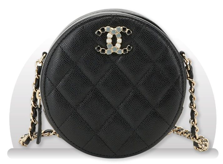 กระเป๋าสไตล์มินิมอล ที่มาพร้อมกับรูปทรงกลม ตัดเย็บด้วยหนังลูกวัวคาเวียร์ เป็นรูปข้าวหลามตัดอันเป็นเอกลักษณ์ของแบรนด์ โลโก้ CC ที่ประสานกันสื่อถึงความสง่างามและสไตล์ฝรั่งเศสชั้นสูง Gabrielle "Coco" Chanel ตัวอักษร CC บนกระเป๋าทำจากวัสดุคริสตัล เรียงกันเป็นรูป C ไขว้ สายสะพายเป็นแบบสายโลหะร้อยหนัง สายสะพายยาวสูงสุด 21 นิ้ว สวมงามเรียบง่ายหรูหรา มีซิปเปิด-ปิด อะไหล่สีทอง